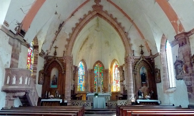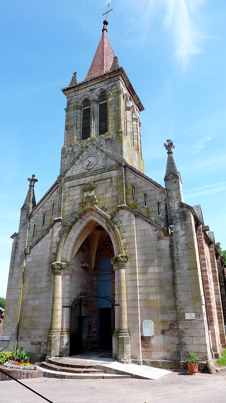 – Et l’église reconstruite à la place d’une chapelle abritant des vitraux d’un maître-verrier d’Elbach (Haut(Rhin), des statues représentant entre autres, St Valbert, et dans le clocher une des plus anciennes cloches de Haute-Saône (1563).