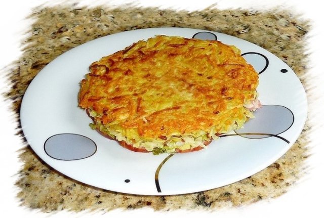 – Recouvrir d’une couche de fondue de chou et poser dessus le paillasson de pommes de terre.