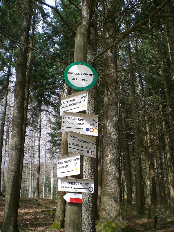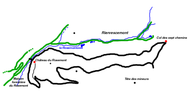 Ne vous trompez pas de chemin pour le retour ! Il y en a deux qui redescendent sur Riervescemont. Celui qui est cerclé de bleu vous ferait revenir à votre voiture par la route... alors même s’il indique le "parking", c’est le grand chemin, large et interdit à toute circulation qu’il faudra emprunter (ronds bleus). Vous n’aurez plus alors qu’à le suivre en écoutant chanter la Rosemontoise.