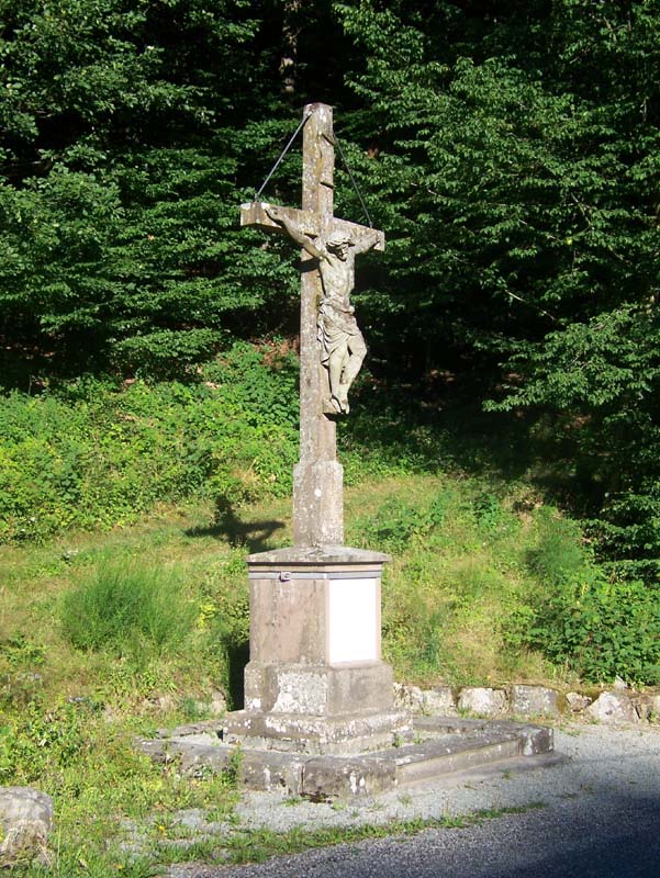 Un peu plus loin, juste derrière le calvaire, un petit chemin monte dans la forêt : il vous ramènera au point de départ en évitant la route étroite et ses virages sans visibilité.