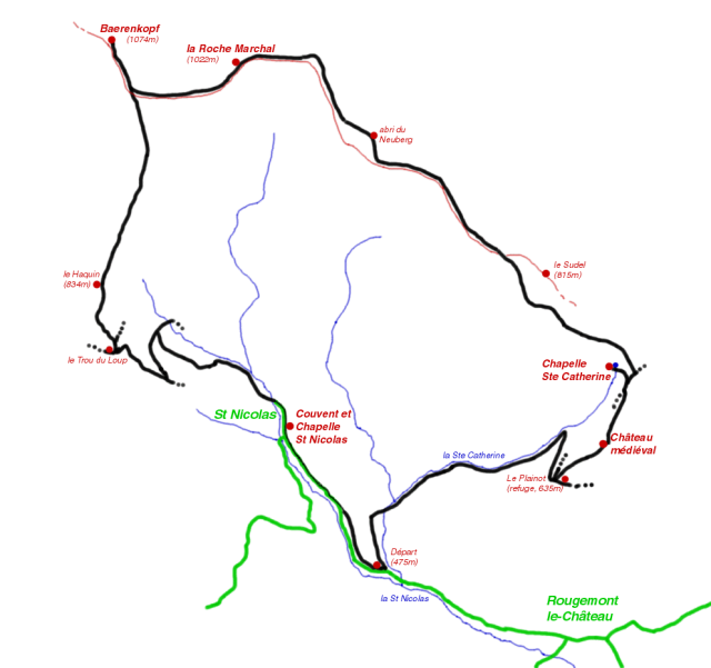 Une première ascension vous conduira aux ruines du vieux Château de Rougemont. Il faudra monter encore pour gagner le Baerenkopf, qui constitue le sommet de notre parcours. La descente, bien pentue, vous ramènera à Saint Nicolas, puis au point de départ.