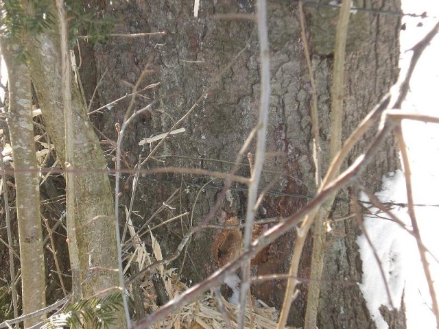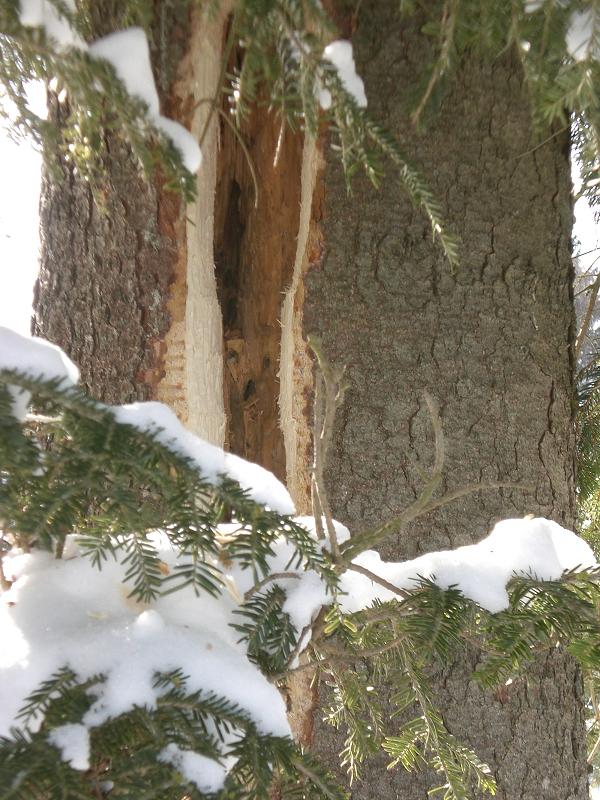 A noter : peut-être pourrez-vous observer ces trous dans le tronc d’un épicéa. Il s’agit vraisemblablement d’un pic noir qui cherche à se nourrir des vers d’un arbre malade, ou à faire son nid.