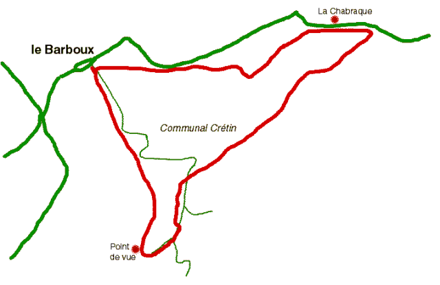 Le chemin continue vers l’est, sur le même versant que la montée, jusqu’à une ferme découverte. De là, il faut bifurquer sur la gauche et redescendre vers le Barboux.