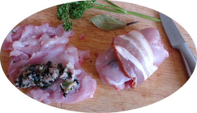 – Farcir avec cet appareil les cuisses de lapin. Les rouler et les fermer en les entourant d’une tranche de lard.
