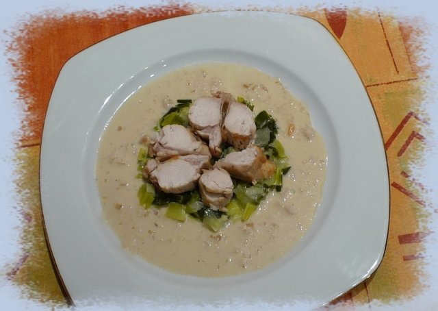 Râble de lapin au savagnin, jeunes poireaux étuvés