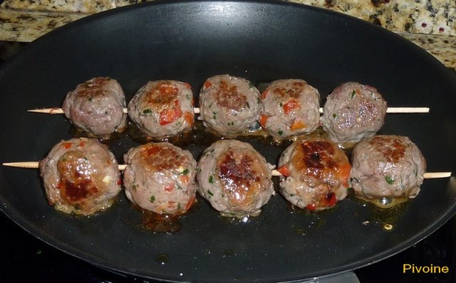 – Placer les brochettes dans une poêle huilée et laisser cuire environ 20 minutes sur feu moyen en les retournant souvent. La viande doit être cuite et les boulettes bien dorées.