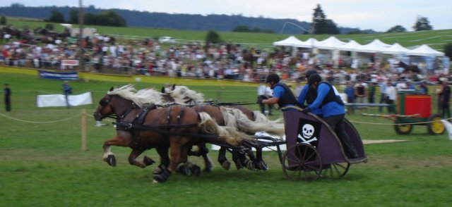 Le spectacle est au rendez-vous tant la puissance de quatre chevaux de traits lancés au galop est impressionnante. D’ailleurs, un équipage a été disqualifié suite à une mauvaise appréciation des distances. Un attelage en a rattrapé un autre au point qu’au moment de doubler, le cheval à la corde est monté sur le char qui le précédait. Le groom souffre d’une entorse et le cheval, qui a trébuché en redescendant, s’en sort avec une luxation de l’épaule. Emporté par les autres, il n’a rien pu faire pour empêcher la collision.
