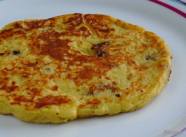 – Faire chauffer dans une poêle antiadhésive un peu d’huile et y verser la valeur de 4 ou 5 belles cuillères de purée.